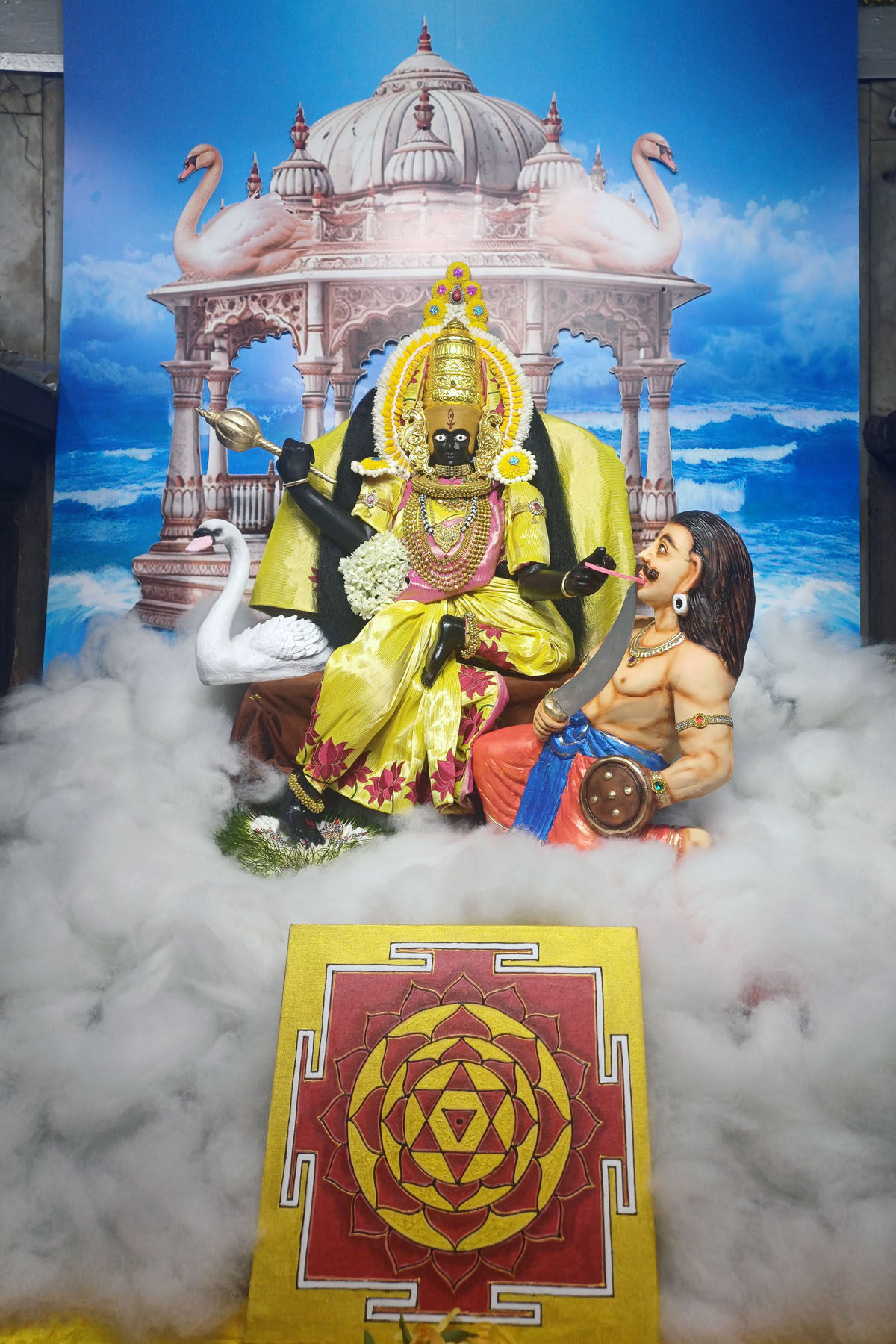 इतिहास : एकदा सत्ययुगात सकल ब्रह्मांडात मोठे वादळ, उत्पात माजले, तेव्हा हे अरिष्ट थांबण्यासाठी भगवान विष्णूंनी, सौराष्ट्रातील हरिततीर्थाकाठी श्रीदेवीची उपासना केली असता, श्रीविष्णूंच्या तपतेजापासून चैत्रशुद्ध अष्टमीस हिचा उद्भव झाला. ही आठवी महाविद्या असून, मृत्युंजय हा हिचा सदाशिव आहे. ही श्रीकुलातील देवता, दाक्षिणाम्नायपीठस्था आहे.
