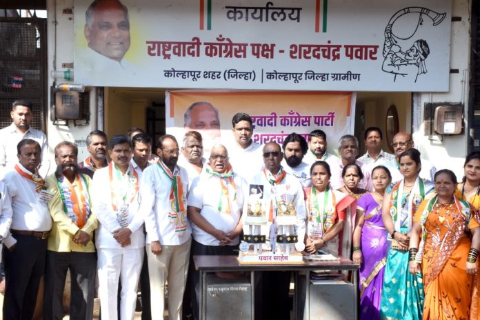 या कार्यक्रमानंतर पक्ष कार्यालयात जिल्हाध्यक्ष व्ही. बी. पाटील व शहराध्यक्ष आर. के. पोवार यांच्या प्रमुख उपस्थितीत केक कापून तसेच शरद पवार यांना दीर्घायुष्य लाभो अशा सदिच्छा व्यक्त करीत मोठ्या उत्साहात वाढदिवस साजरा केला. याप्रसंगी जिल्हाध्यक्ष व्ही. बी. पाटील यांनी संदेश दिला की, या वाढदिवसाच्या शुभ मुहूर्तावर कोल्हापूर महानगरपालिकेच्या निवडणुकीत विजयश्री खेचून आणण्याच्या कामात सर्वांनी झोकून देऊन कामास लागावे.