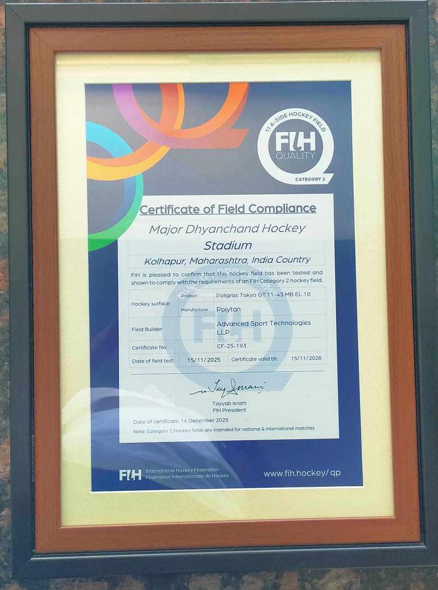 सदर ॲस्ट्रोटर्फ मैदानाची फेडरेशन ऑफ इंटरनॅशनल हॉकी (FIH) कडून १५ नोव्हेंबर २०२५ रोजी तपासणी करण्यात आली. तपासणीनंतर मानांकनाचे प्रमाणपत्र कोल्हापूर महानगरपालिकेस प्राप्त झाले आहे. यामुळे मेजर ध्यानचंद हॉकी स्टेडियमवर आता राष्ट्रीय व आंतरराष्ट्रीय दर्जाचे हॉकी सामने खेळविण्याचा मार्ग मोकळा झाला आहे.