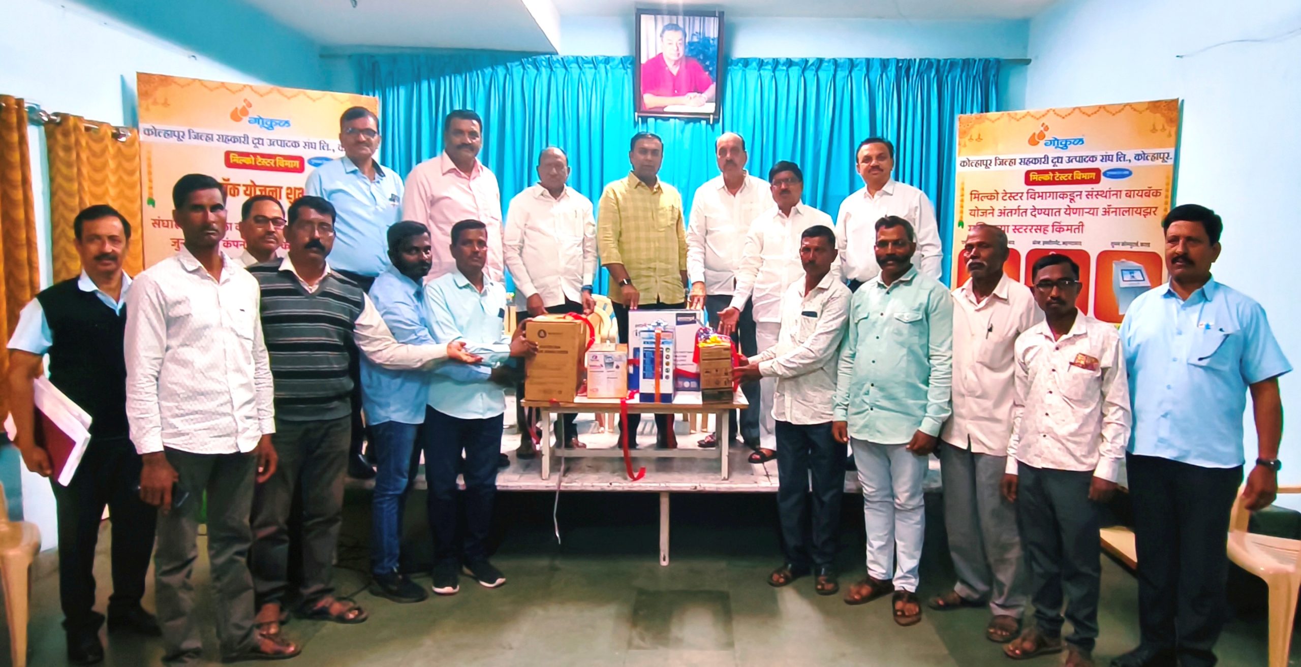 या योजनेमधील सहभागी गोकुळ संलग्न प्राथमिक दूध संस्थांना नवीन ॲनालायझर मशीनचे वाटप गोकुळचे चेअरमन नविद मुश्रीफ यांच्या हस्ते व संचालक मंडळाच्या उपस्थितीत गोकुळ शिरगाव येथे करण्यात आले. यावेळी प्राथमिक दूध संस्थांचे प्रतिनिधी व मिल्क ॲनालायझर कंपनीचे प्रतिनिधी, कर्मचारी उपस्थित होते.