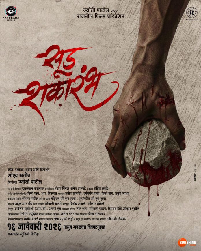 या चित्रपटाचे दमदार पोस्टर नुकतेच प्रदर्शित झाले आहे. या पोस्टरमध्ये रक्ताने माखलेला हात दगड घट्ट पकडून उभा दिसतो आहे. हा दगड सूड, संताप आणि हिंसक संघर्षाचं प्रतीक वाटतो. साधी पार्श्वभूमी आणि लाल रंगातील धारदार शीर्षक चित्रपटाच्या कठोर, थरारक आणि सूडाने पेटलेल्या कथेला प्रभावीपणे दर्शवतं.