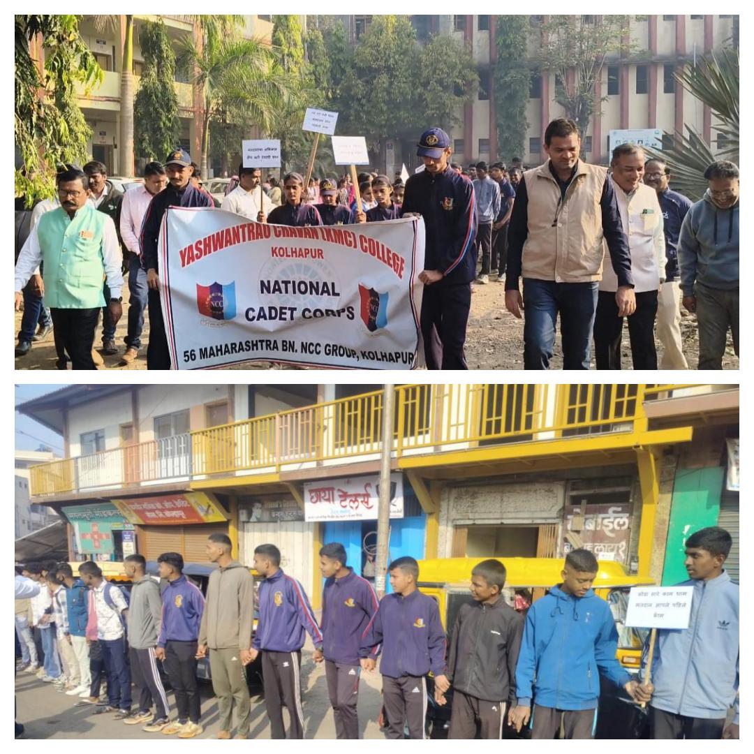 कोल्हापूर महानगरपालिका सार्वत्रिक निवडणूक २०२६ च्या पार्श्वभूमीवर मतदारांमध्ये मतदानाबाबत जागरूकता निर्माण करण्यासाठी महानगरपालिकेच्या वतीने विविध उपक्रम राबविण्यात येत आहेत. या मतदार जनजागृती अभियानांतर्गत बुधवारी यशवंतराव चव्हाण के.एम.सी. कॉलेजच्या विद्यार्थ्यांनी शहरातील गंगावेश एसटी स्टॅण्ड, रंकाळावेस एसटी स्टॅण्ड तसेच रंकाळा परिसरात प्रभात फेरी काढून नागरिकांना मतदानाचे महत्त्व पटवून दिले.