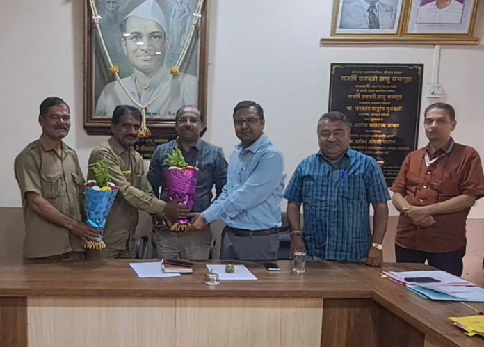 कोल्हापूर महापालिकेच्या परिवहन उपक्रमाच्या के.एम.टी. बसमधून प्रवास करणारे प्रवासी हिम्मत पाटील आणि त्यांच्या पत्नी यांची के.एम.टी. बसमध्ये विसरलेली १० तोळे सोन्याचे जिन्नस असलेली पिशवी प्रामाणिकपणे परत करणाऱ्या वाहक भगवान पांडुरंग पाटील (रा.वाशी, ता.करवीर) आणि चालक प्रकाश ज्ञानू झोरे, (रा.मोरेवाडी) यांचा सत्कार के.एम.टी. उपक्रमाच्या प्रधान कार्यालयात उप आयुक्त परितोष कंकाळ आणि अति. परिवहन व्यवस्थापक संजय सरनाईक यांचे हस्ते करण्यात आला.