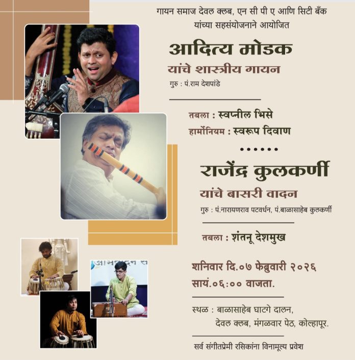 या संगीत सभेत आदित्य मोडक (पुणे) यांचा शास्त्रीय गायनाविष्कार आणि पं. राजेंद्र कुलकर्णी (पुणे) यांचे बासरीवादन शनिवार दि. ७ फेब्रुवारी २०२६ या दिवशी सायंकाळी ६ वाजता संस्थेच्या बाळासाहेब घाटगे दालनामध्ये आयोजित करण्यात आला आहे.