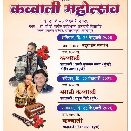 दि. २१ फेब्रुवारी रोजी हाजी सुलतान नाजा व रोहित अली यांचा कव्वालीचा कार्यक्रम होणार असून दि. २२ फेब्रुवारीला राहुल शिंदे तर दि. २३ फेब्रुवारी रोजी हैदर नाजा, पुणे यांचा कव्वालीचा कार्यक्रम सादर होणार आहे. कव्वाली ही केवळ गायकी नसून ती एक आध्यात्मिक अनुभूती आहे. कोल्हापूरकरांनी मोठ्या संख्येने उपस्थित राहून या महोत्सवाचा आणि सुरांच्या या अनोख्या प्रवासाचा आनंद घ्यावा, असे आवाहन संचालक, सांस्कृतिक कार्य संचालनालयाच्या वतीने करण्यात आले आहे.