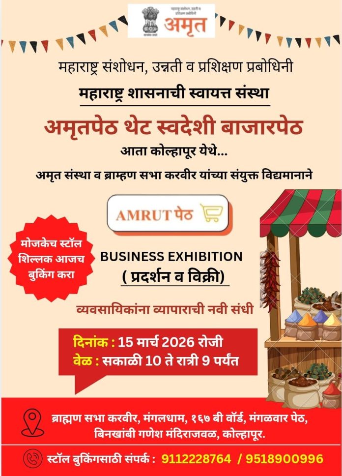 लक्षित गटातील उद्योजकांसाठी त्यांनी निर्माण केलेल्या उत्पादन अथवा विक्री करत असलेल्या उत्पादनाला बाजारपेठ उपलब्ध करून देण्याच्या उद्देशाने भव्य प्रदर्शन व विक्रीसाठी स्टॉल्स उपलब्ध करून देण्यासाठी भव्य प्रदर्शन व विक्री मेळाव्याचे आयोजन रविवारी (दि. १५) सकाळी १० ते रात्री ९ या वेळेत ब्राह्मण सभा करवीर, मंगलधाम, कोल्हापूर येथे करण्यात आले आहे. मेळाव्यासाठी स्टॉल बुकिंगसाठी इच्छुक उद्योजकांनी दि. १४ मार्च रोजी सायंकाळी ५ वाजेपर्यंत आपली नावनोंदणी करावी, असे आवाहन अमृतचे कोल्हापूर जिल्हा व्यवस्थापक प्रशांत जोशी यांनी केले आहे.