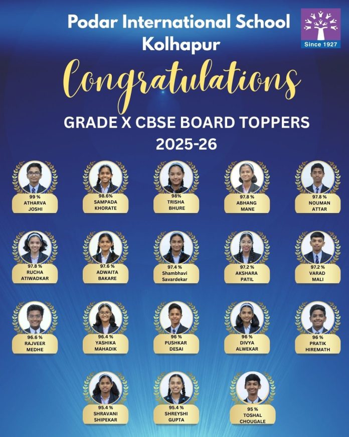 पोदार इंटरनॅशनल स्कूल, कोल्हापूरने सीबीएसई इयत्ता १० वी बोर्ड परीक्षेत यंदाही दैदिप्यमान यश संपादन करत शैक्षणिक क्षेत्रातील आपली उत्कृष्ट परंपरा कायम राखली आहे. यावर्षी शाळेचा निकाल १००% लागला असून सर्व विद्यार्थी यशस्वीरित्या उत्तीर्ण झाले आहेत. विशेष म्हणजे, टॉपर विद्यार्थ्यांनी कोणत्याही कोचिंग क्लासचा आधार न घेता हे उल्लेखनीय यश मिळवले आहे.